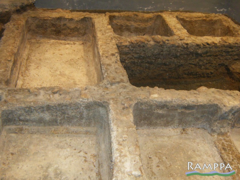 Las balsas aparecen separadas por un pasillo central de acceso a éstas de 1’90m de anchura delimitado al sur por una lastra de piedra y una pequeña cubeta arrasada por una zanja de cimentación moderna que afecta toda la parte sur de la factoría. Dicha cubeta parece haber tenido una funcionalidad distinta al resto con un tamaño considerablemente menor (0’35m de profundidad).