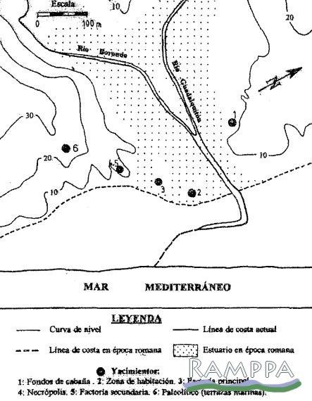 En la confluencia de la desembocadura de los ríos Gualquitón y Borondo, sobre un pequeño cerro amesetado a 9 m de altura se localiza esta cetaria que fue documentada mediante prospección superficial. Se han identificado en este yacimiento varias estructuras asociadas a saladeros, destacando al menos dos: una de ellas seccionada por la desaparición del muro de apoyos y la otra bien identificada como una balsa rectangular de 2,82x2,15 m, de la que se ha podido atestiguar una profundidad de más de 0,50 m. A un centenar de metros de este enclave, junto a una necrópolis bien documentada, se localizaron más evidencias de vértices de piletas similares a las anteriores, interpretadas como un asentamiento industrial secundario.
