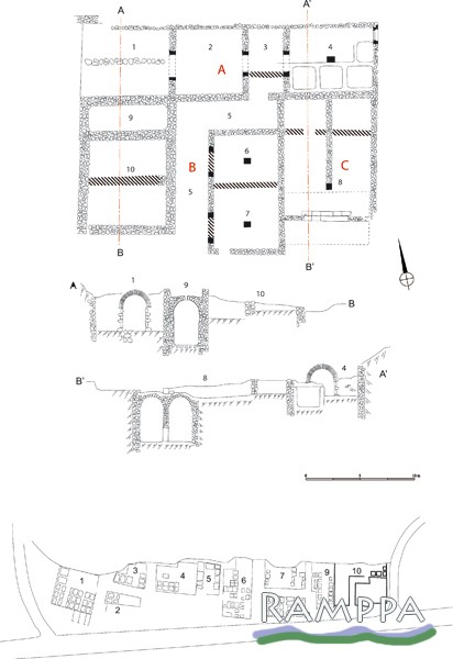 L’Ensemble est formé de deux entités qu’un corridor (5) coudé relie. M. Ponsich et M. Tarradell ont néanmoins considéré à juste titre qu’il était pertinent de décomposer l’ensemble en trois parties (nommées A, B et C) [fig. 1].