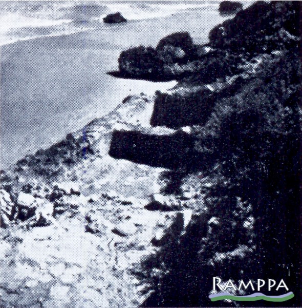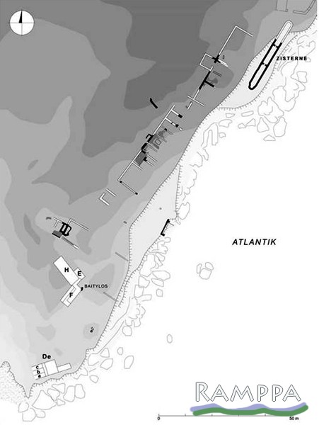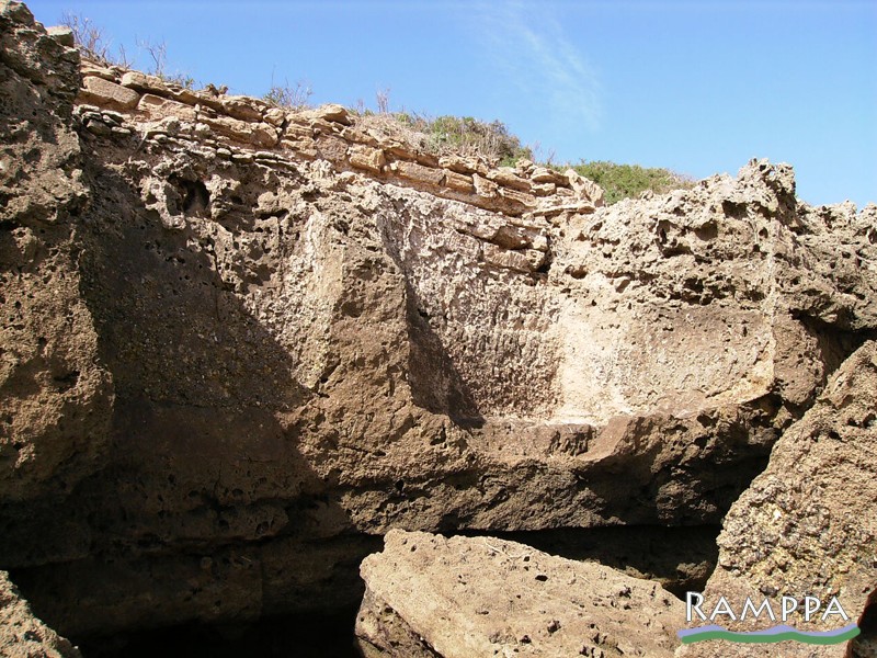 Creusés dans le grès dunaire avec des parois couvertes d’un mortier de tuileau étanche, deux bassins, encore en place sur le flanc de la falaise en 1961 (fig. 2), mais aujourd’hui partiellement brisés par l’érosion marine et basculés sur la plage (fig. 1 et 3), ont été exhumés dans les années 1960 dans la partie sud-est de l’île. Les bassins géminés communiquaient par deux petites ouvertures situées en bas et en haut de la cloison séparatrice.