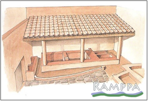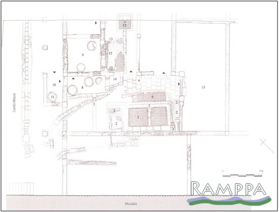 La factoría se organiza en torno a un patio interior al que abren diversas estancias. Y en el se alienan dos piletas mayores (fig. 1, nº 1) y al menos cuatro más pequeñas (fig. 1, nº 2). El conjunto central, formado por dos tanques grandes y otros dos pequeños, estaban cubiertos por un tejado sustentado por pilares. El patio interior está pavimentado con técnicas diferentes según las áreas de circulación: losas de piedra (fig. 1, nº 3) y opus signinum (fig. 1, nº 4) y presenta una ligera inclinación para favorecer la evacuación de los restos orgánicos de la producción hacia un sumidero (fig. 1. 6). En el SE se sitúan tres estancias que contienen dolia (fig. 1, nos. 8-10), una de las cuales invade la zona porticada de una calle (cardo minor). Al N del patio central, se documenta una sala alargada pavimentada con signinum y con una pila (fig. 1, nº 12). para la limpieza del pescado conectada con una cloaca. Tanto es ésta como en el desagüe del dolium de la habitación que ocupa el pórtico del cardo, se han detectado restos de escama y espinas de pescado. La sala más oriental es una habitación rectangular que tal vez funcionó como almacén de la fábrica.