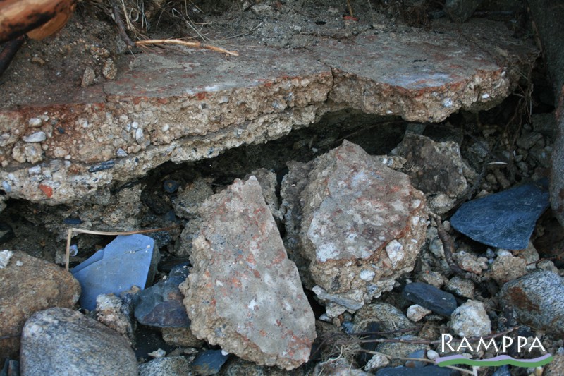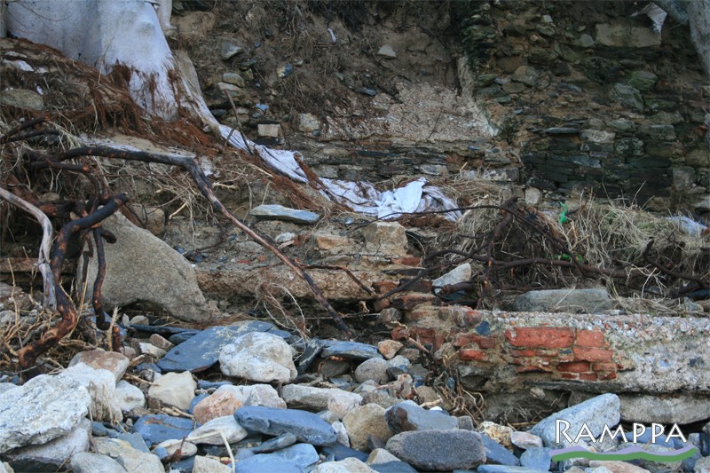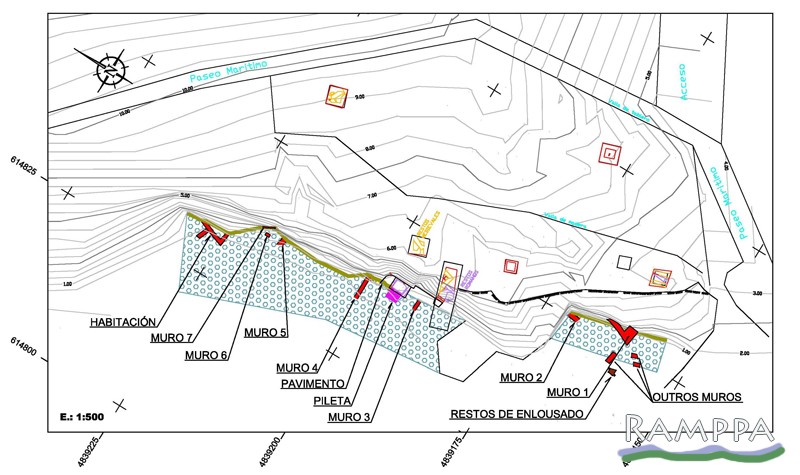 Al sur de la zona intervenida en 2007 quedaron a la vista dos? tanques de salazón revestidos de opus signinum y abundantes restos de mortero por la playa (las fotos provienen de Asociación Mariña Patrimonio 2014).