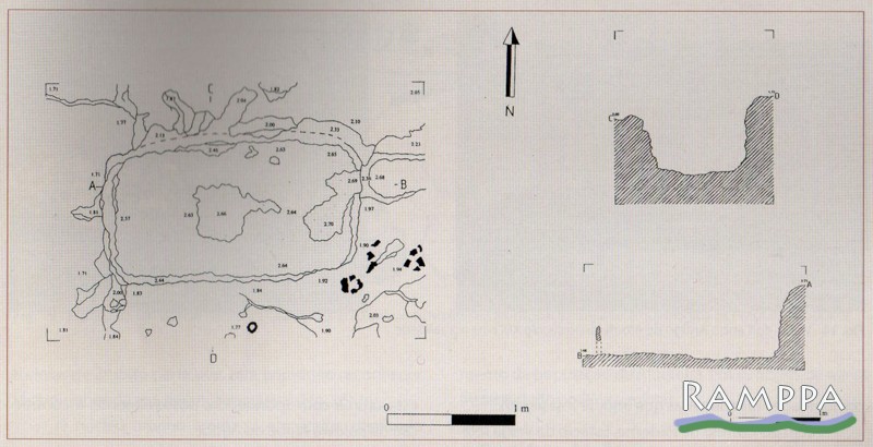 En la extremidad de una arriba muy erosionada por la acción marina se identificó una pileta excavada en la roca con las siguientes dimensiones: 2,12x1,12x0,74m. El fondo de la pileta presenta las típicas características de las piletas de salazones, pero con un canal de desagüe en el lado E, de función / finalidad desconocida.