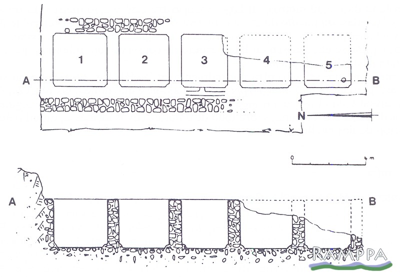 Situé à moins d’un kilomètre au nord de l’embouchure de l’oued Smir, sur la plage, et découvert en 1953, cet établissement a été fouillé l’année suivante (fig. 1). Il n'a été reconnu qu'un ensemble rectiligne, orienté nord-sud, de 6 m sur 5 m, composé de cinq cuves alignées quasiment identiques qu’encadrent deux murs maçonnés respectivement de 0,60 et 0,85 m de large (fig. 2). Les fouilleurs envisagent la possibilité d’une seconde rangée vers l’est, détruite par l’érosion marine. Les cuves exhumées, séparées par des cloisons d’environ 0,60 m de largeur, mesurent 2,65 m de largeur, de 2,40 à 2,80 m de longueur et 2,30 m de profondeur, ce qui donne une capacité volumétrique comprise entre 14,62 et 17 m3. Le bassin n° 5 possède en outre une petite cuvette latérale de 30 cm de diamètre et de 6 cm de profondeur pour recueillir les résidus au moment du nettoyage.