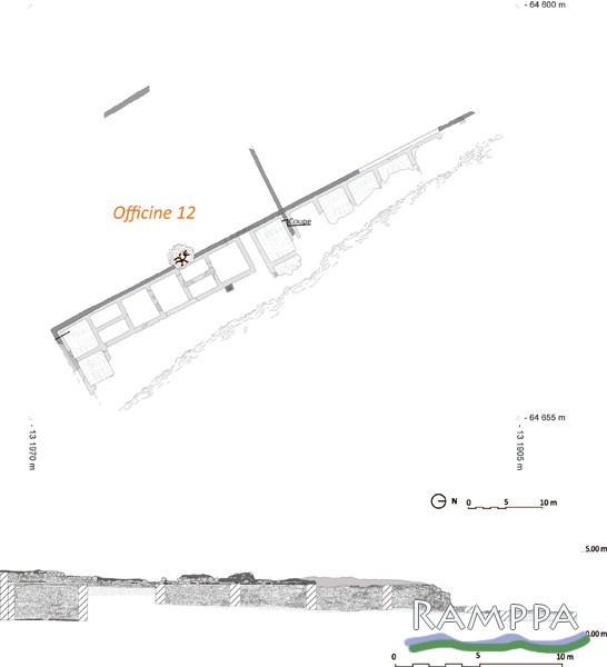 Localizada na praia, a Oficina 12 está ao lado e ligada à Oficina 13 pela mesma parede-mestra a sudoeste e as duas deveriam pertencer à mesma fábrica isolada, com um pátio fechado nas traseiras da Oficina 12. Uma única fila de sete módulos de tanques, dois com tanques geminados, está preservada, assim como os vestígios de três outros tanques nas filas perpendiculares. Muito incompleta por causa da destruição pelas marés, esta oficina deveria ser uma grande oficina rectangular com quatro filas de tanques em torno de um grande pátio. O seu comprimento (ou largura?) é de 34,15m e a sua largura conservada de 11,80m, correspondente a uma superfície incompleta de 402,97m2.