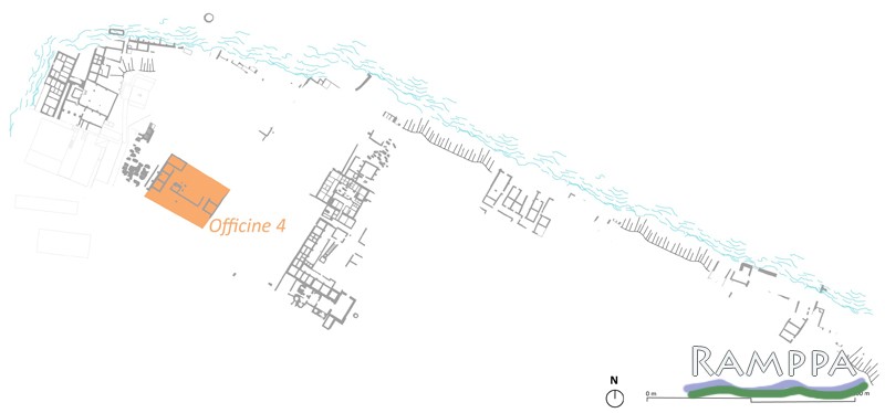 A oficina 4 seria um grande edifício rectangular do qual as escavações dos anos 70 do século XX expuseram o comprimento completo de 32,80m e uma largura visível, talvez incompleta, de 23,80m, o que corresponde a uma superfície mínima de 773,50m3. A sua parte nordeste ainda está por descobrir.
