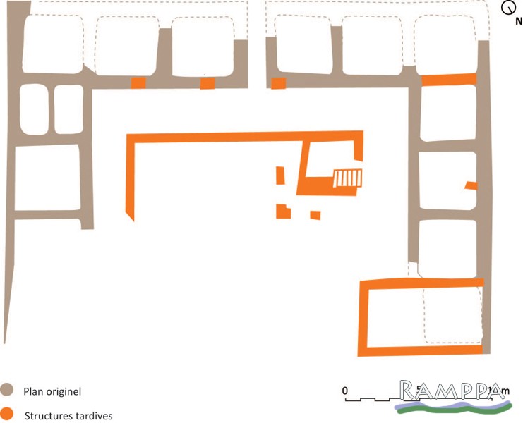 A oficina apresenta paredes tardias que a subdividem em unidades mais pequenas e um pequeno edifício com escadas no pátio.
